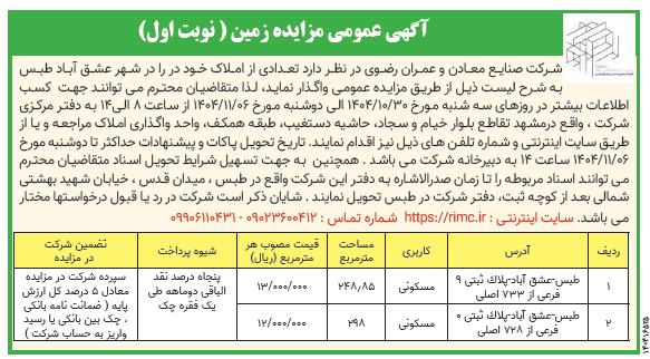 شرکت صنایع معادن و عمران رضوی در نظر دارد تعدادی از املاک خود در را در شهر عشق آباد طبس به شرح لیست ذیل از طریق مزایده عمومی واگذار نماید، لذا متقاضیان محترم می توانند جهت  کسب اطلاعات بیشتر در روزهای سه شنبه مورخ ۱۴۰۴/۱۰/۳۰ الی دوشنبه مورخ ۱۴۰۴/۱۱/۰۶ از ساعت ۸ الی۱۴ به دفتر مرکزی شرکت ، واقع درمشهد تقاطع بلوار خیام و سجاد، حاشیه دستغیب، طبقه همکف، واحد واگذاری املاک مراجعه و یا از طریق سایت اینترنتی و شماره تلفن های ذیل نیز اقدام نمایند. تاریخ تحویل پاکات و پیشنهادات حداکثر تا دوشنبه مورخ ۱۴۰۴/۱۱/۰۶ ساعت ۱۴ به دبیرخانه شرکت می باشد . همچنین  به جهت تسهیل شرایط تحویل اسناد متقاضیان محترم می توانند اسناد مربوطه را تا زمان صدرالاشاره به دفتر این شرکت واقع در طبس ، میدان قدس ، خیابان شهید بهشتی شمالی بعد از کوچه ثبت، دفتر شرکت در طبس تحویل نمایند . شایان ذکر است شرکت در رد یا قبول درخواستها مختار می باشد.