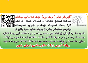 شرکت صنایع معادن و عمران رضوی در نظر دارد بابت عملیات تهیه و اجرای تاسیسات برقی و مکانیکی یکی از پروژه های خود واقع در شهر مشهد از طریق فراخوان عمومی نسبت به شناسایی پیمانکاران واجد شرایط در این حوزه اقدام نماید. لذا متقاضیان محترم می توانند با مراجعه به انتهای همین صفحه ضمن مشاهده اسناد ارزیابی ، مدارک خود را حداکثر تا ساعت ۱۶:۰۰ مورخ ۱۴۰۴/۰۸/۲۱ در پاکت سر بسته به دبیرخانه شرکت تحویل نمایند.