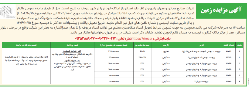 شرکت صنایع معادن و عمران رضوی در نظر دارد تعدادی از املاک خود در را در شهر بیرجند به شرح لیست ذیل از طریق مزایده عمومی واگذار نماید، لذا متقاضیان محترم می توانند جهت کسب اطلاعات بیشتر در روزهای سه شنبه مورخ ۰۹/۱۰/۱۴۰۴ الی دوشنبه مورخ ۱۵/۱۰/۱۴۰۴ از ساعت ۸ الی۱۴ به دفتر مرکزی شرکت ، واقع درمشهد تقاطع بلوار خیام و سجاد، حاشیه دستغیب، طبقه همکف، حوزه واگذاری املاک مراجعه و یا از طریق سایت اینترنتی و شماره تلفن های ذیل نیز اقدام نمایند. تاریخ تحویل پاکات و پیشنهادات حداکثر تا دوشنبه مورخ ۱۵/۱۰/۱۴۰۴ ساعت ۱۴ به دبیرخانه شرکت می باشد.همچنین به جهت تسهیل شرایط تحویل اسناد متقاضیان محترم می توانند اسناد مربوطه را تا زمان صدرالاشاره به دفتر این شرکت واقع در بیرجند ، بلوار مسافر ، بعد از مرکز پلاک گذاری ، نرسیده به میدان قائم تحویل نمایند. شایان ذکر است شرکت در رد یا قبول درخواستها مختار می باشد.