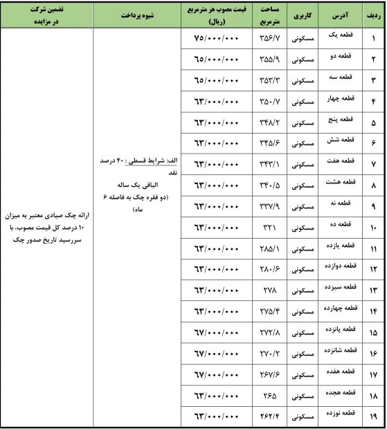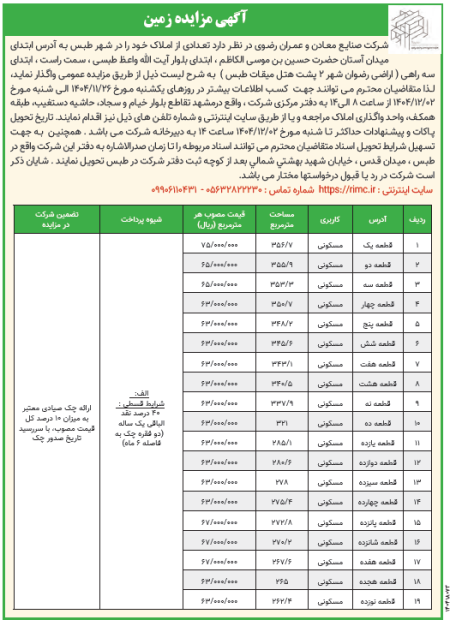 شرکت صنایع معادن و عمران رضوی در نظر دارد تعدادی از املاک خود را در شهر طبس به ادرس ابتدای میدان آستان حضرت حسین بن موسی الکاظم ، ابتدای بلوار آیت الله واعظ طبسی ، سمت راست ، ابتدای سه راهی ( اراضی رضوان شهر ۲ پشت هتل میقات طبس ) به شرح لیست ذیل از طریق مزایده عمومی واگذار نماید، لذا متقاضیان محترم می توانند جهت کسب اطلاعات بیشتر در روزهای یکشنبه مورخ ۱۴۰۴/۱۱/۲۶ الی شنبه مورخ ۱۴۰۴/۱۲/۰۲ از ساعت ۸ الی۱۴ به دفتر مرکزی شرکت ، واقع درمشهد تقاطع بلوار خیام و سجاد، حاشیه دستغیب، طبقه همکف، واحد واگذاری املاک مراجعه و یا از طریق سایت اینترنتی و شماره تلفن های ذیل نیز اقدام نمایند. تاریخ تحویل پاکات و پیشنهادات حداکثر تا شنبه مورخ ۱۴۰۴/۱۲/۰۲ ساعت ۱۴ به دبیرخانه شرکت می باشد . همچنین به جهت تسهیل شرایط تحویل اسناد متقاضیان محترم می توانند اسناد مربوطه را تا زمان صدرالاشاره به دفتر این شرکت واقع در طبس ، میدان قدس ، خیابان شهید بهشتی شمالی بعد از کوچه ثبت دفتر شرکت در طبس تحویل نمایند . شایان ذکر است شرکت در رد یا قبول درخواستها مختار می باشد.