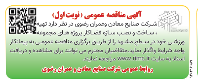 شرکت صنایع معادن وعمران رضوی در نظر دارد تهیه ، ساخت و نصب سازه فضاکار پروژه های مجموعه ورزشی خود در سطح مشهد را از طریق برگزاری مناقصه عمومی به پیمانکار واجد شرایط واگذار نماید. لذا متقاضیان محترم می توانند با مراجعه به انتهای همین صفحه ضمن مشاهده اسناد مناقصه  پیشنهاد قیمت خود را حداکثر تا ساعت ۱۶:۰۰ مورخ ۱۴۰۴/۱۱/۰۱ در پاکت سر بسته به دبیرخانه شرکت تحویل نمایند.