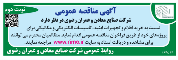 شرکت صنایع معادن و عمران رضوی در نظر دارد دارد نسبت به خرید اقلام ابنیه و تجهیزات تاسیسات الکتریکی و مکانیکی برای پروژه های خود از طریق مناقصه عمومی اقدام نماید. لذا متقاضیان محترم می توانند با مراجعه به انتهای همین صفحه ضمن مشاهده اسناد مناقصه پیشنهاد قیمت خود را حداکثر تا ساعت ۱۳:۰۰ مورخ ۱۴۰۴/۱۰/۱۸ در پاکت سر بسته به دبیرخانه شرکت تحویل نمایند.