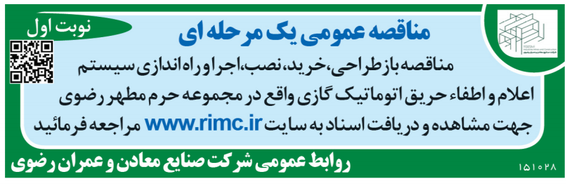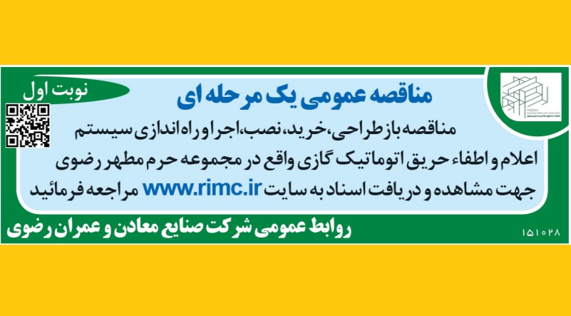 شرکت صنایع معادن و عمران رضوی در نظر دارد مناقصه بازطراحی،خرید، نصب،اجرا و راه اندازی سیستم اعلام و اطفاء حریق اتوماتیک گازی در کتابخانه و پنج فضای حرم مطهر رضوی را از طریق مناقصه عمومی به پیمانکاران و شرکتهای واجد شرایط واگذار نماید ؛ لذا متقاضیان محترم می توانند با مراجعه به انتهای همین صفحه ضمن مشاهده اسناد مناقصه پیشنهاد قیمت خود را حداکثر تا ساعت ۱۴:۰۰ مورخ۱۴۰۴/۰۸/۰۳ در پاکت سر بسته به دبیرخانه شرکت تحویل نمایند. جهت اطلاعات بیشتر با شماره ۰۹۱۵۱۰۳۰۵۸۳ مهندس طبسی تماس حاصل فرمایید.
