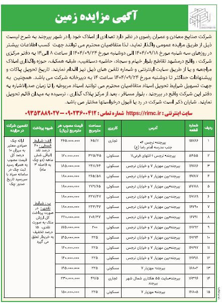 شرکت صنایع معادن و عمران رضوی در نظر دارد تعدادی از املاک خود در را در شهر بیرجند به شرح لیست ذیل از طریق مزایده عمومی واگذار نماید، لذا متقاضیان محترم می توانند جهت کسب اطلاعات بیشتر در روزهای سه شنبه مورخ ۱۴۰۴/۰۹/۱۸ الی دوشنبه مورخ ۱۴۰۴/۰۹/۲۴ از ساعت ۸ الی۱۴ به دفتر مرکزی شرکت ، واقع درمشهد تقاطع بلوار خیام و سجاد، حاشیه دستغیب، طبقه همکف، حوزه واگذاری املاک مراجعه و یا از طریق سایت اینترنتی و شماره تلفن های ذیل نیز اقدام نمایند. تاریخ تحویل پاکات و پیشنهادات حداکثر تا دوشنبه مورخ ۱۴۰۴/۰۹/۲۴ ساعت ۱۴ به دبیرخانه شرکت می باشد. همچنین به جهت تسهیل شرایط تحویل اسناد متقاضیان محترم می توانند اسناد مربوطه را تا زمان صدرالاشاره به دفتر این شرکت واقع در بیرجند ، بلوار مسافر ، بعد از مرکز پلاک گذاری ، نرسیده به میدان قائم تحویل نمایند. شایان ذکر است شرکت در رد یا قبول درخواستها مختار می باشد.